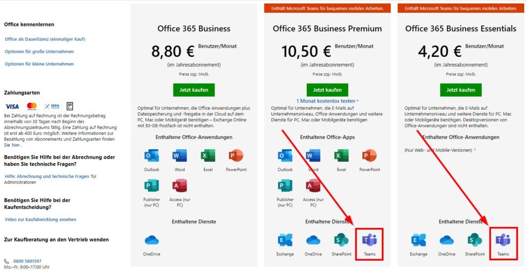 Für die Arbeit in einer Geschäfts-Umgebung empfiehlt sich, alle Benutzer, die regelmäßig Teams-Sitzungen initiieren werden, mit einer Office 365 Business-Variante auszustatten, die Teams als Dienst beinhaltet.